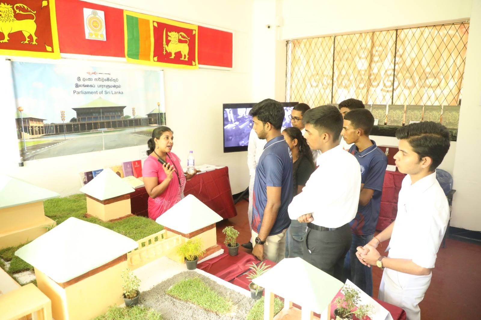 பாராளுமன்ற கட்டடத்தின் மாதிரி, செங்கோலின் மாதிரி, பாராளுமன்ற சபா மண்டபம் வடிவமைக்கப்பட்டுள்ள விதம், சபாநாயகர் சபையில் அணியும் ஆடையின் மாதிரி, சபாநாயகர்கள் பற்றிய தகவல்கள் மற்றும் பாராளுமண்டத்தைப் பற்றிய தகவல்கள் அடங்கிய புத்தகங்கள் மற்றும் சஞ்சிகைகள் இந்தக் கண்காட்சி கூடத்தில் காட்சிப்படுத்தப்பட்டுள்ளன. அதற்கமைய, கல்வி ரீதியாக முக்கியமான இந்த கண்காட்சி கூடத்தைப் பார்வையிடுவதற்குப் பெருமளவானோர் கலந்துகொண்டிருந்தனர். பாராளுமன்ற தொடர்பாடல் திணைக்களத்தின் வளப் பங்களிப்பில் வித்தியாலய மாணவர்கள் இந்தக் கண்காட்சி கூடத்தை நடத்துகின்றனர்.