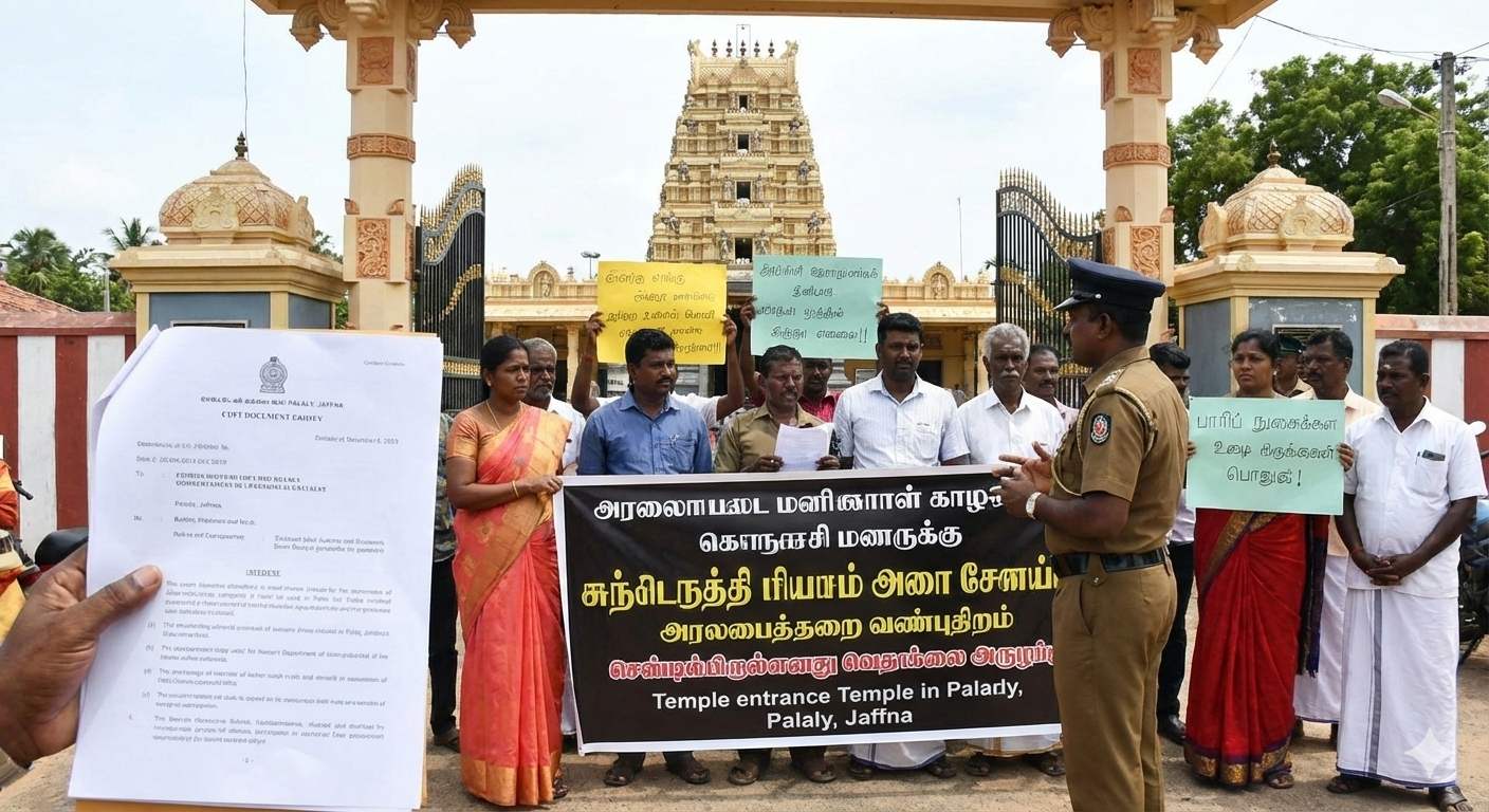 யாழ்ப்பாணம் (டிசம்பர் 21, 2025): நீதிமன்ற உத்தரவை மீறி பலாலி காவல் பிரிவின் தாய்செட்டி பகுதியில் உள்ள ஒரு கோவிலுக்கு முன்னால் ஆர்ப்பாட்டம் செய்த ஐந்து சந்தேக நபர்கள் இன்று (21) பலாலி காவல்துறையினரால் கைது செய்யப்பட்டனர்.