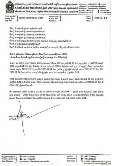2025 පාසල් වර්ෂය අවසන් වන දිනය සංශෝධනය වෙයි: 2026 නව පාසල් වාරය ජනවාරි 05 ඇරඹේ