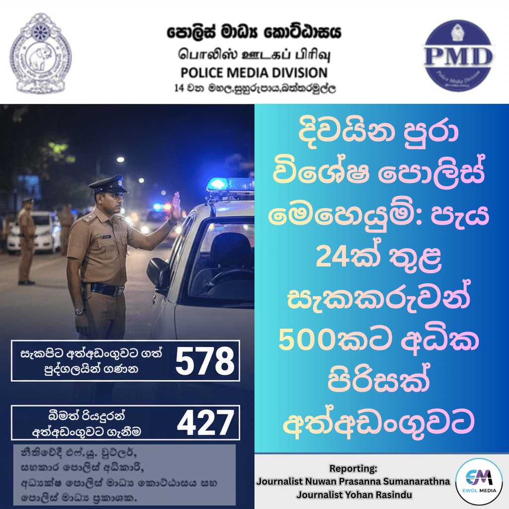“පොලිස්පතිතුමාගේ නියෝග මත අපරාධ සහ මත්ද්රව්ය වැටලීම් සඳහා සියලු කොට්ඨාස මට්ටමින් මෙහෙයුම් ක්රියාත්මක වේ. මහජන සාමය සහ ආරක්ෂාව තහවුරු කිරීම රජයේ සහ පොලිසියේ මූලික අරමුණයි.”