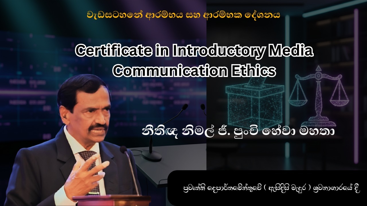 රජයේ ප්රවෘත්ති දෙපාර්තමේන්තුවේ (ඇසිදිසි මැදුර) පැවැත්වූ “පරිපූරක ජනමාධ්ය ආචාර ධර්ම සහ නවක සන්නිවේදන පුහුණු වැඩසටහනේ” (Certificate in Introductory Media Communication Ethics) සමාරම්භක අවස්ථාවේදී මෙම දේශනය පවත්වන ලදී.