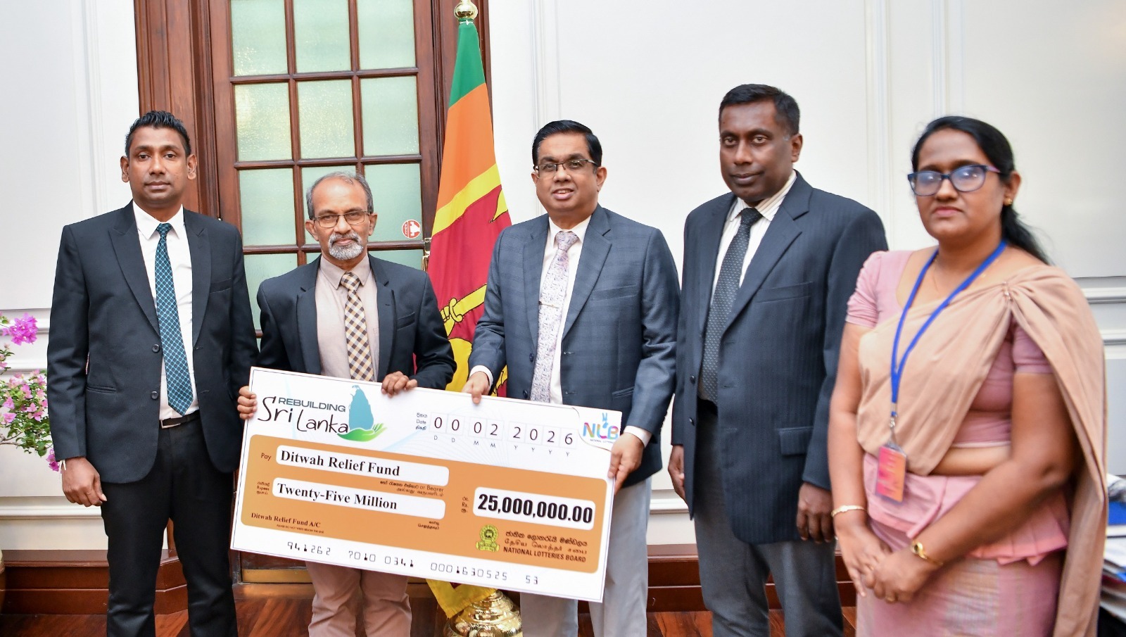Share Facebook Twitter LinkedIn Pinterest Email WhatsApp මූල්යමය පරිත්යාගයක් දිට්වා සුළි කුණාටුවෙන් පීඩාවට පත් ජනතාවට සහන සැලසීමේ රජයේ ‘Rebuilding Sri Lanka’ අරමුදලට ජාතික ලොතරැයි මණ්ඩලය විසින් රුපියල් මිලියන 25ක මූල්යමය පරිත්යාගයක් සිදු කරනු ලැබීය. ජාතික ලොතරැයි මණ්ඩලයේ සභාපති එම්. ඩී. සිරිල් ඇන්තනි පෙරේරා මහතා විසින් ඊට අදාළ චෙක්පත අද (26) පස්වරුවේ ජනාධිපති කාර්යාලයේදී ජනාධිපති ලේකම් ආචාර්ය නන්දික සනත් කුමානායක මහතා වෙත පිළිගන්වන ලදී. ජාතික ලොතරැයි මණ්ඩලයේ සාමාන්යාධිකාරි ඒ. එම්. අරීෆ්, ප්රධාන මූල්ය නිලධාරී ටී. ඩී. රසිකා ප්රබෝධිනී, සහකාර සාමාන්යාධිකාරි (අලෙවි) කසුන් කුරුදුකුඹුර යන මහත්ම මහත්මීහුද මෙම අවස්ථාවට එක්ව සිටියහ. Post Views: 1