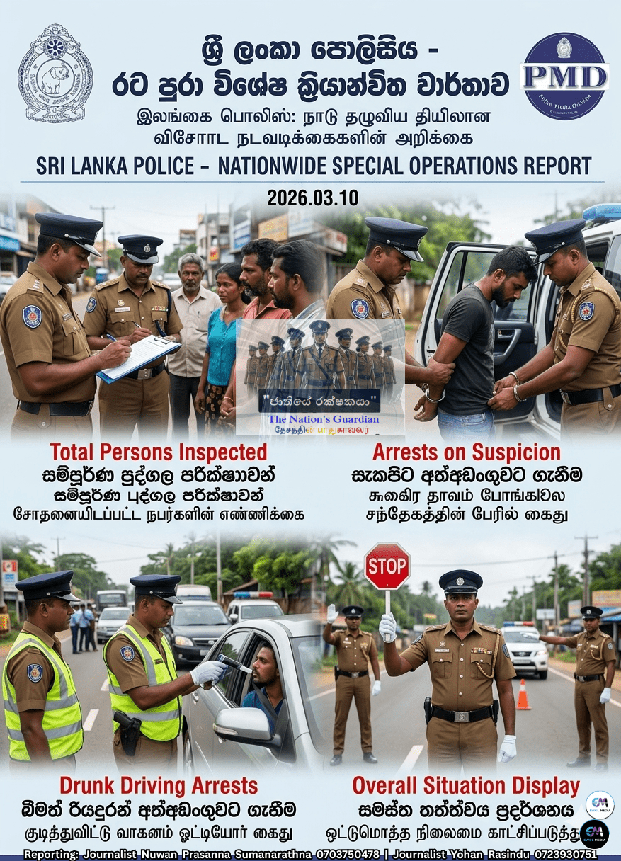 கொழும்பு – இலங்கை பொலிஸ் ஊடகப் பிரிவினால் வெளியிடப்பட்ட அறிக்கையின்படி, 2026 மார்ச் 09 ஆம் திகதி நாடு தழுவிய ரீதியில் முன்னெடுக்கப்பட்ட விசேட நடவடிக்கைகளின் பெறுபேறுகள் வெளியாகியுள்ளன. பொலிஸ் மா அதிபரின் நேரடி அறிவுறுத்தலின் பேரில், குற்றச் செயல்கள் மற்றும் போதைப்பொருள் விநியோகத்தை தடுக்கும் நோக்கில் அனைத்து பொலிஸ் பிரிவுகளையும் உள்ளடக்கியதாக இந்த நடவடிக்கைகள் முன்னெடுக்கப்பட்டன.