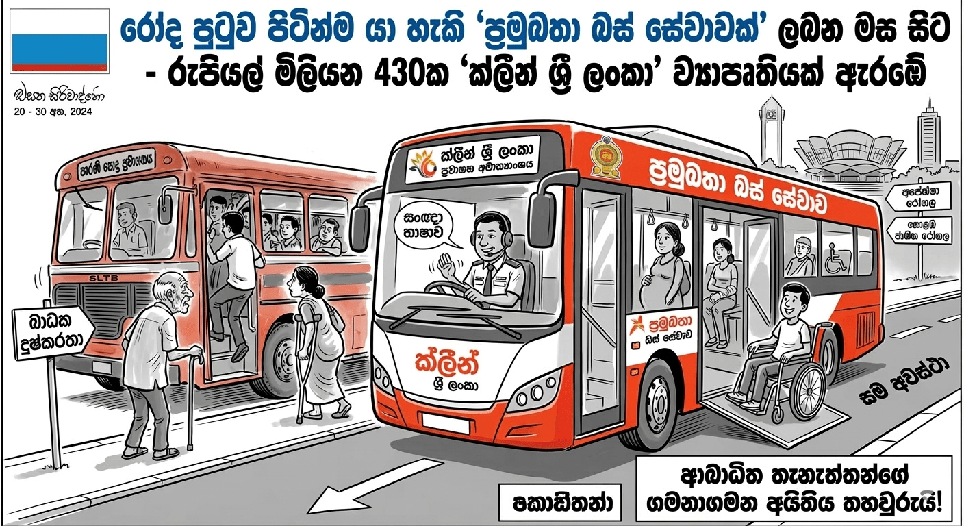 කොළඹට එන පළමු බස් රථ 10 හම්බන්තොට වරායට….. ශ්රී ලංකාවේ පොදු ප්රවාහන පද්ධතිය තුළ මෙතෙක් අවධානයට ලක් නොවූ ආබාධ සහිත තැනැත්තන්ගේ ගමනාගමන අයිතිය තහවුරු කරමින්, ඔවුන් වෙනුවෙන්ම වෙන් වූ විශේෂ ‘ප්රමුඛතා බස් රථ සේවාවක්’ ලබන මස සිට ආරම්භ කිරීමට ප්රවාහන, මහාමාර්ග සහ නාගරික සංවර්ධන අමාත්යාංශය සහ ‘ක්ලීන් ශ්රී ලංකා’ වැඩසටහන තීරණය කර ඇත.