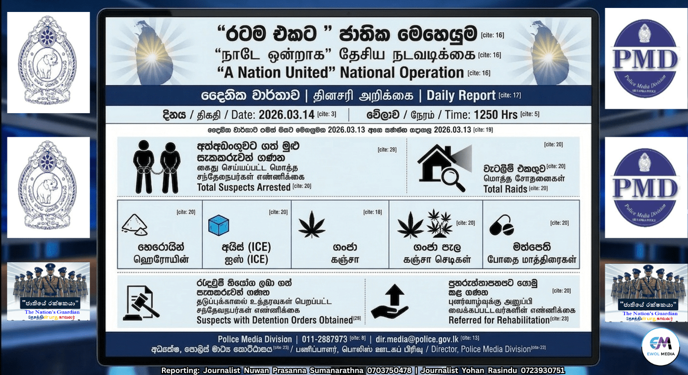 පොලිස්පතිතුමාගේ උපදෙස් පරිදි ක්රියාත්මක මෙම විශේෂ මෙහෙයුමේ 2026 මාර්තු 13 වන දිනට අදාළ දෛනික වාර්තාව පොලිස් මාධ්ය ප්රකාශක, සහකාර පොලිස් අධිකාරි නීතිවේදී ෆ්රෙඩ්රික් වුට්ලර් මහතා විසින් නිකුත් කර ඇත.