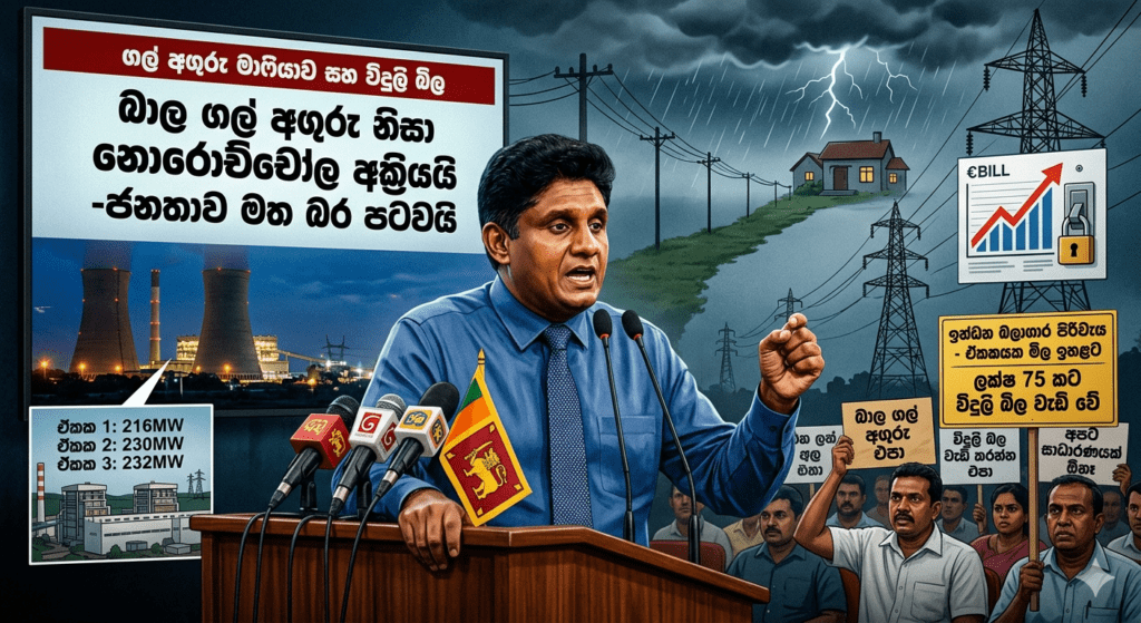 මෙරට ප්රධානතම විදුලි උත්පාදන මූලාශ්රය වන නොරොච්චෝල ලක්විජය බලාගාරයට බාල ගල් අගුරු භාවිත කිරීම හේතුවෙන් සමස්ත විදුලි පද්ධතියම බරපතල අනතුරක පවතින බවත්, එහි පාඩුව පියවා ගැනීමට රජය 75 ලක්ෂයක් පාරිභෝගිකයන් මත දැවැන්ත බදු බරක් පැටවීමට සූදානම් වන බවත් විපක්ෂ නායක සජිත් ප්රේමදාස මහතා අනාවරණය කරයි.