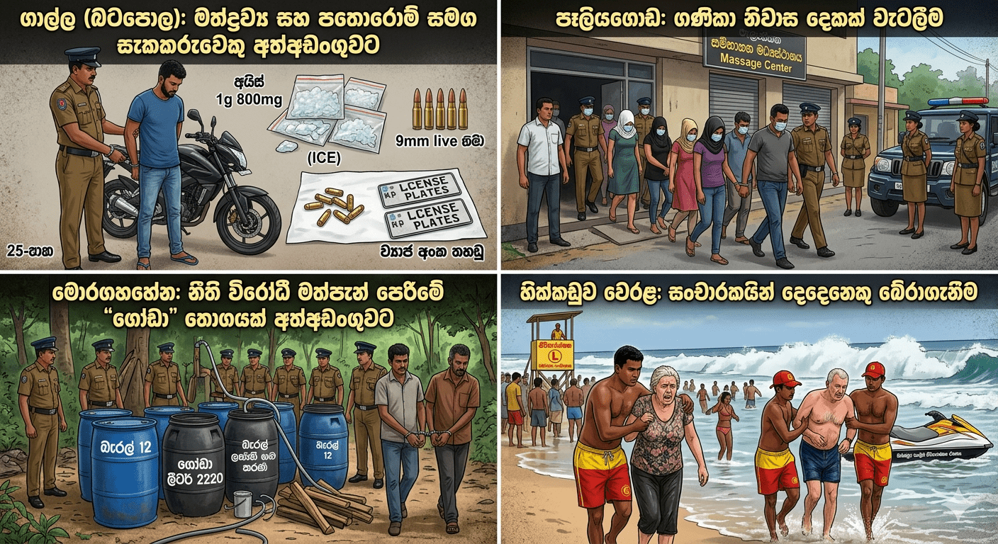 ගාල්ල (බටපොල): ව්යාජ අංක තහඩු සහිත යතුරුපැදියක්, මිලිමීටර් 9 වර්ගයේ ජීව පතොරොම් 09ක් සහ අයිස් මත්ද්රව්ය (ග්රෑම් 1 මිලිග්රෑම් 800) සමඟ 25 හැවිරිදි සැකකරුවෙකු අත්අඩංගුවට ගෙන ඇත.