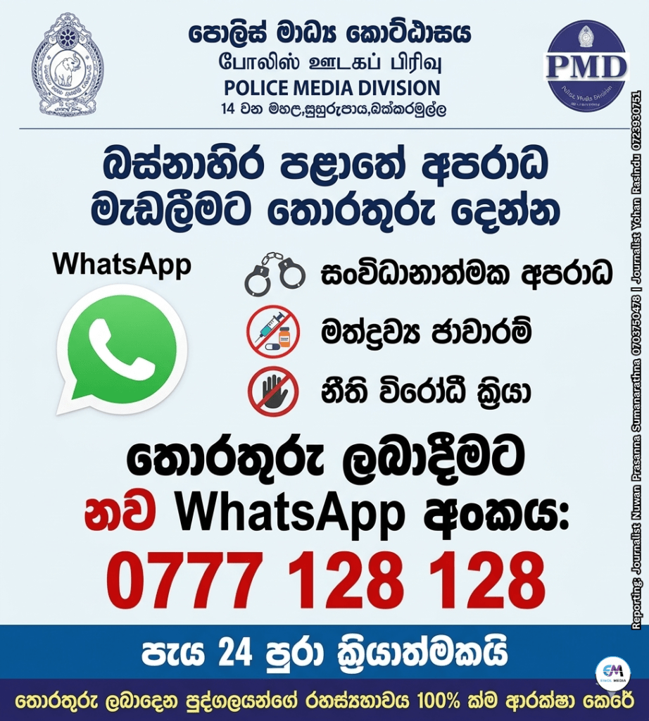 බස්නාහිර පළාත තුළ සිදුවන අපරාධ, මත්ද්රව්ය ජාවාරම් සහ අනෙකුත් නීති විරෝධී ක්රියා මැඩලීම සඳහා පොලිස් මාධ්ය කොට්ඨාසය විසින් නව WhatsApp අංකයක් හඳුන්වා දී ඇත.