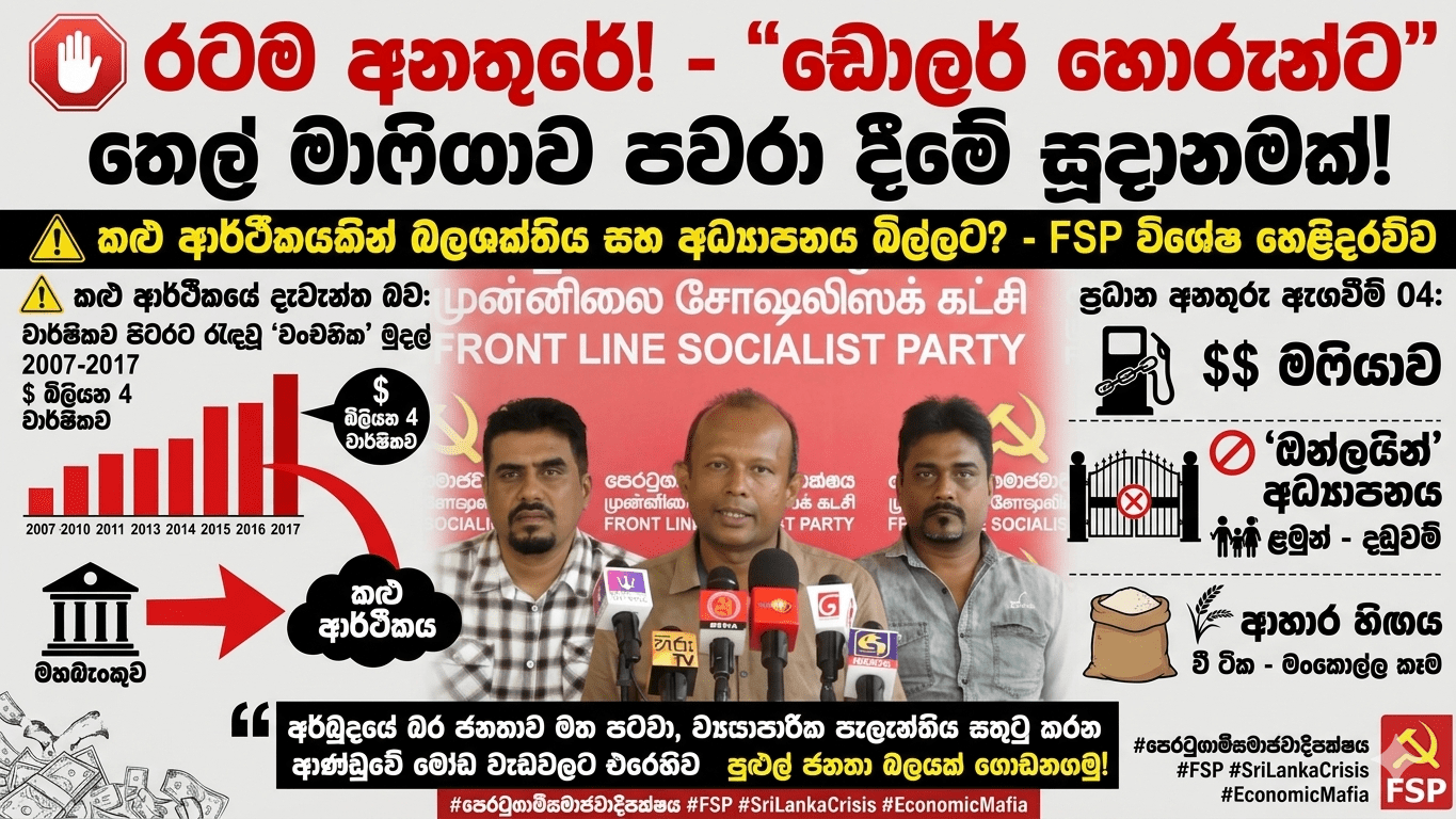 @ තෙල් මාෆියාවට පාර කැපීම: මහාපරිමාණ ව්‍යාපාරිකයන්ට තමන්ගේ ඩොලර්වලින් තෙල් ගෙන්වීමට අවසර දීම යනු, මහබැංකු පාලනයෙන් තොර “කළු ආර්ථිකයක්” නිර්මාණය කිරීමකි. විදෙස් ශ්‍රමිකයන් සහ වතු කම්කරුවන් දහඩිය හෙළා උපයා මෙරටට නොඑවා පිටරට රඳවාගත් ඩොලර් බිලියන ගණනක “වංචනික මුදල්” සුදු කිරීමට ආණ්ඩුව මෙලෙස ඉඩකඩ සලසා දී ඇත.