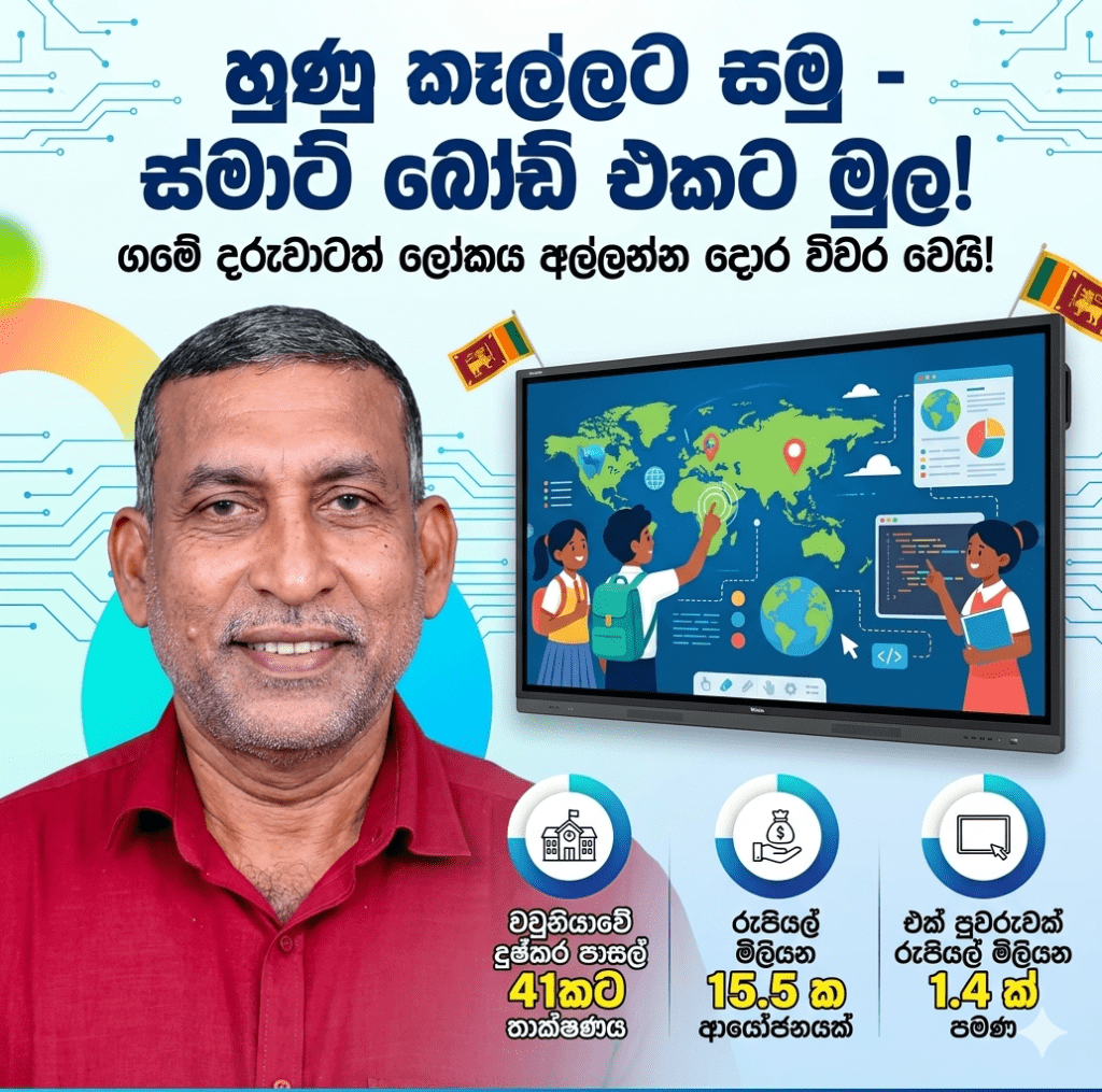 ශ්රී ලංකාවේ අධ්යාපන පද්ධතිය නවීකරණය කිරීමේ තීරණාත්මක පියවරක් සනිටුහන් කරමින්, වවුනියාව දිස්ත්රික්කයේ දුෂ්කර පාසල් 41ක් ඉලක්ක කරගත් සුවිශේෂී ස්මාට් බෝඩ් (Smart Board) බෙදාදීමේ වැඩසටහනක් ආරම්භ විය.