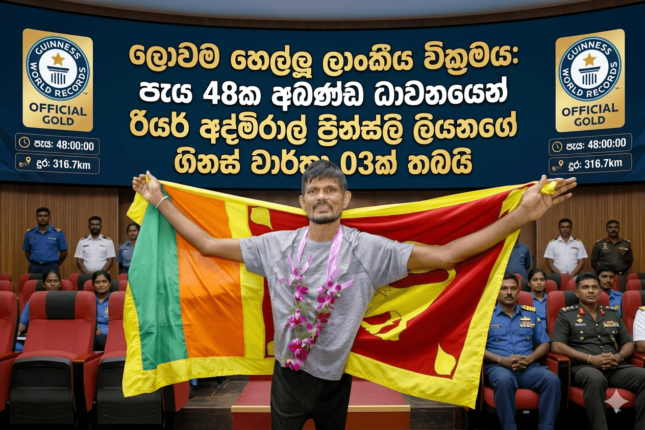 ශ්‍රී ලංකා නාවික හමුදාවේ විශ්‍රාමික ජ්‍යේෂ්ඨ නිලධාරියෙකු වන රියර් අද්මිරාල් ප්‍රින්ස්ලි ලියනගේ මහතා, යාන්ත්‍රික නොවන ඇවිදීමේ යන්ත්‍රයක් (Manual Treadmill) මත අඛණ්ඩව පැය 48ක් ධාවනයේ යෙදෙමින් නව ගිනස් ලෝක වාර්තා තුනක් (03) පිහිටුවීමට සමත්ව ඇත.