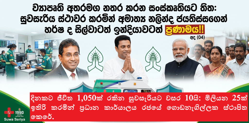 දිනකට ජීවිත 1,050ක් රකින සුවසැරියට වසර 10යි: මිලියන 25ක් ඉතිරි කරමින් ප්රධාන කාර්යාලය රජයේ ගොඩනැගිල්ලක ස්ථාපිත කෙරේ.