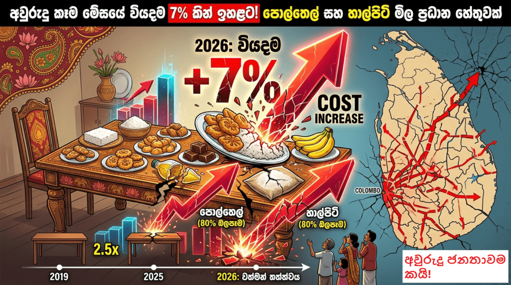 2019 වසරේ පැවති මිල ගණන් සමඟ සැසඳීමේදී, 2026 වසරේ අවුරුදු කෑම මේසයේ වියදම 2.5 ගුණයකින් පමණ ඉහළ ගොස් ඇති බව දත්ත විශ්ලේෂකයෝ පෙන්වා දෙති.