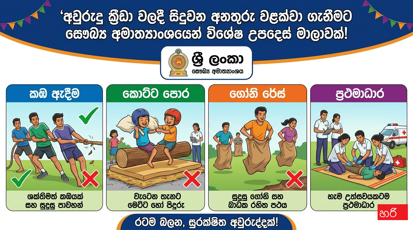 එළඹෙන උත්සව සමයේ දිවයින පුරා පවත්වනු ලබන අවුරුදු උත්සව සහ ක්‍රීඩා ඉසව්වලදී සිදුවිය හැකි අනතුරු හා බරපතල සෞඛ්‍ය ගැටලු වළක්වා ගැනීම සඳහා සෞඛ්‍ය අමාත්‍යාංශය විසින් විශේෂ මාර්ගෝපදේශ මාලාවක් නිකුත් කර තිබේ.