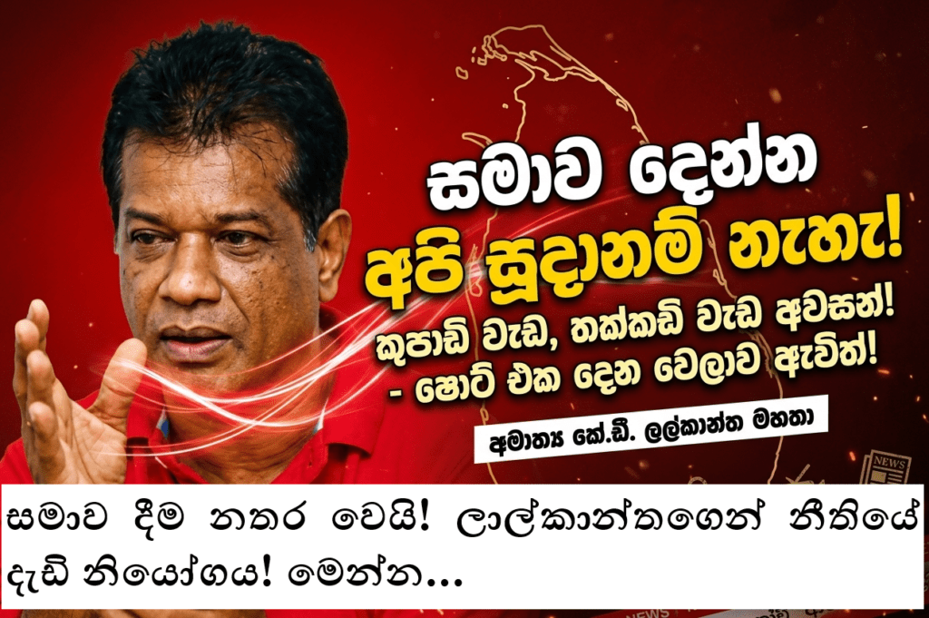 “රටේ දේශපාලන සංස්කෘතිය උඩුයටිකුරු කරමින්, අසත්ය පතුරුවන්නන්ට සහ අකටයුතුකම් කරන්නන්ට එරෙහිව රජය සිය උපරිම බලය ක්රියාත්මක කිරීමට සූදානම් බව අමාත්ය කේ.ඩී. ලාල්කාන්ත මහතා පවසයි. ජනතාව ලබා දුන් 159ක අතිමහත් බලය හෑල්ලු කිරීමට ඉඩ නොතබන බවත්, වැරදි කරන්නන්ට කිසිදු සමාවක් හිමි නොවන බවත් අමාත්යවරයා අවධාරණය කළේය.”